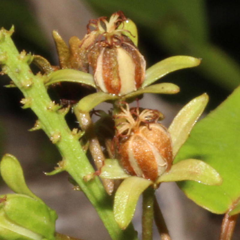 Croton lucidus female flower with slender, bifid styles and much smaller sepals