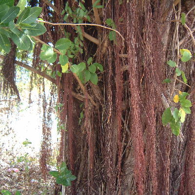 Dense masses of aerial roots hanging from the branches gives the tree a "bearded" appearance.